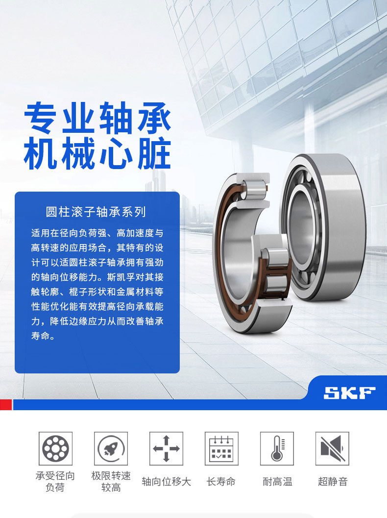 圓柱滾子與滾道為線接觸軸承。負荷能力大,主要承受徑向負荷。滾動體與套圈擋邊摩擦小,適于高速旋轉(zhuǎn)。根據(jù)套圈有無擋邊,可以分有NU、NJ、NUP、N、NF等單列圓柱滾子軸承,及NNU、NN等雙列圓柱滾子軸承。該軸承是內(nèi)圈、外圈可分離的結(jié)構(gòu)。