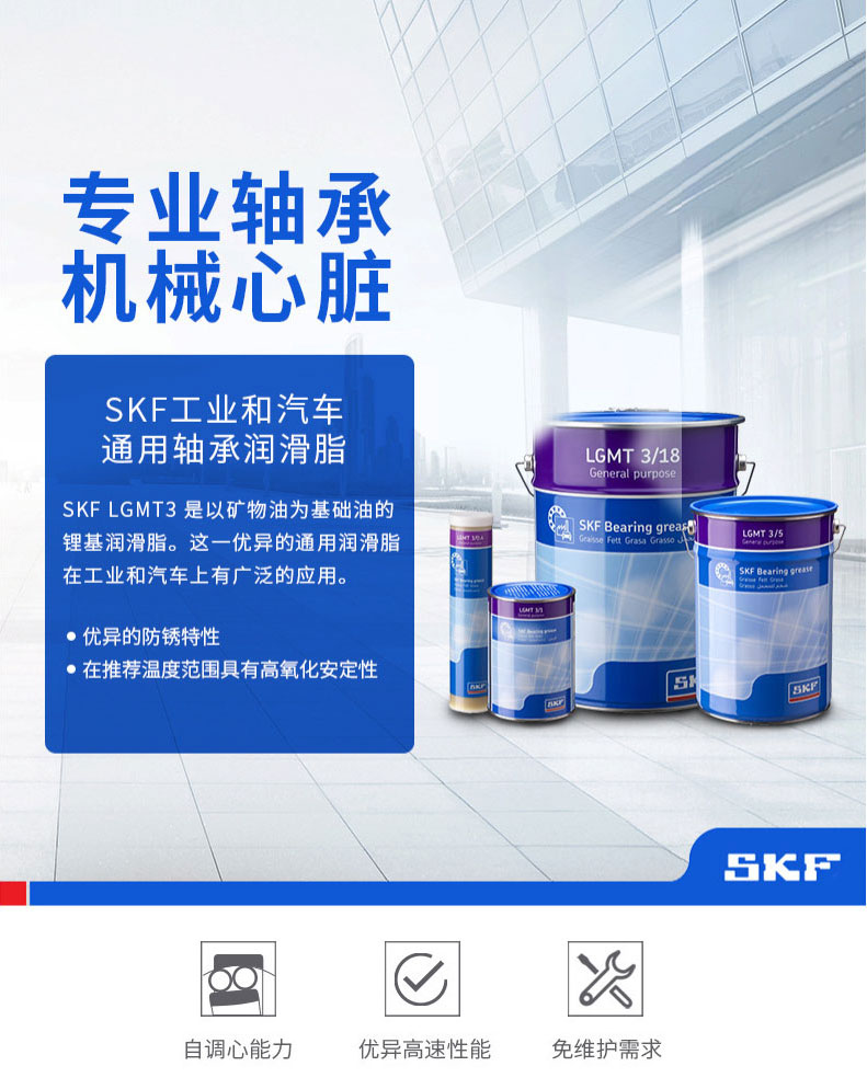 SKF工業(yè)和汽車通用軸承潤滑脂 SKF LGMT3是以礦物油為基礎(chǔ)油的鋰基潤滑脂。這一優(yōu)異的通用潤滑脂在工業(yè)和汽車上有廣泛的應(yīng)用。