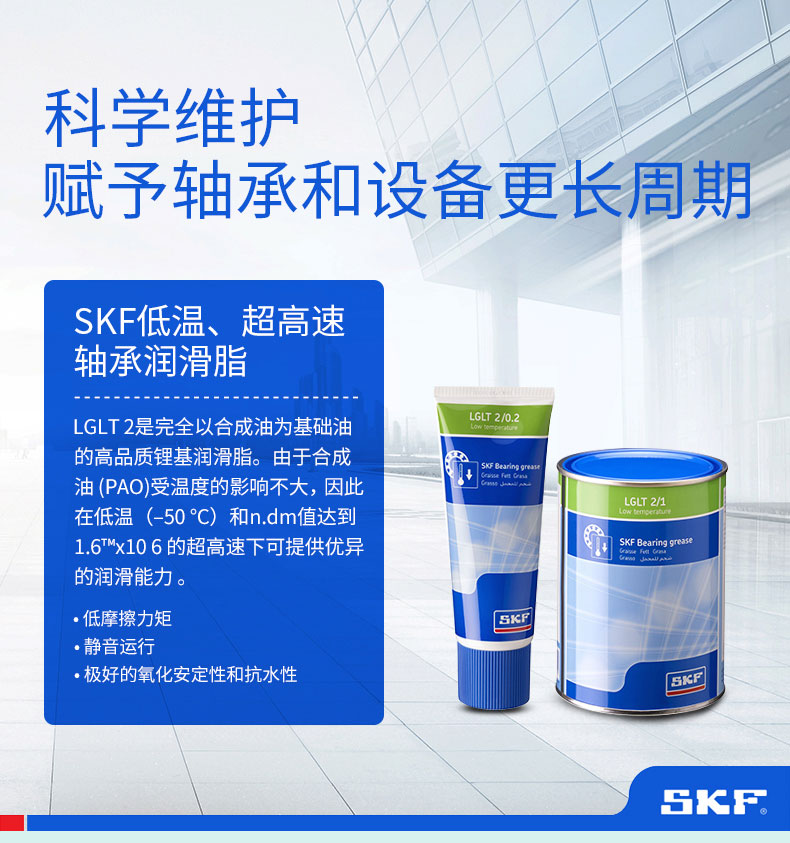 SKF LGLT 2是完全以合成油為基礎(chǔ)油的鋰基潤(rùn)滑脂。 它的特殊增稠劑技術(shù)和低粘度油(PAO)可以實(shí)現(xiàn)優(yōu)秀的潤(rùn)滑性能。 適合低至–50 °C (–60 °F) 的低溫和超高速(n dm值可達(dá)到1.6 x 106 )。